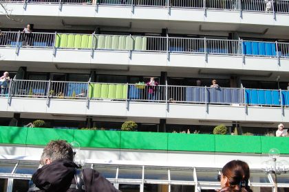 „Hoch auf dem gelben Waaagen“, schmettern Hein Lindgens und Josef Hubert Bruynswyck am Mittwochnachmittag. Begleitet werden sie dabei von Frank Hecht am Akkordeon, von Michaela Chiric an der Querflöte – und von vielen, vielen Bewohnerinnen und Bewohnern des Seniorenzentrums Haus Hörn. Ein Mitsingkonzert, und das in Zeiten des Kontaktverbots? Kein Problem, denn die Seniorinnen und Senioren stehen und sitzen auf den Balkonen ihrer Wohnungen. Ein Balkonmitsingkonzert, also. Ebenfalls textsicher dabei und sichtlich froh, dass alles geklappt hat: Dr. Ingrid Schmidt, Leiterin des Betreuten Wohnens an Haus Hörn. Sie war diejenige, die den Stein ins Rollen gebracht hat.