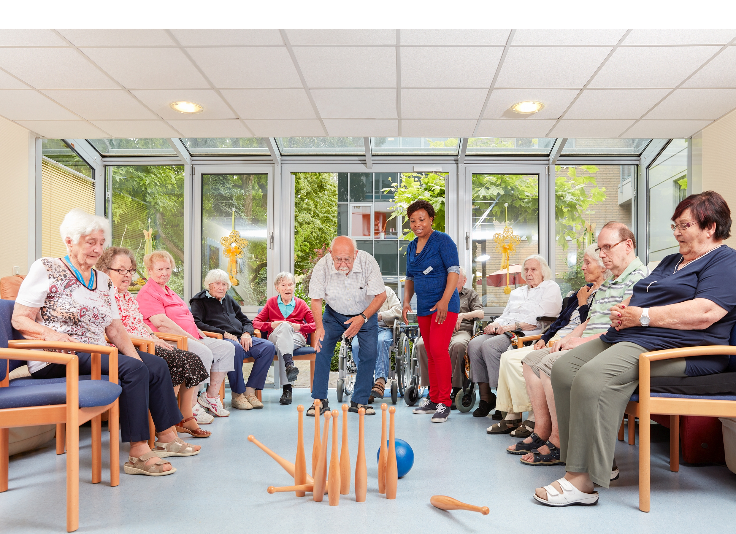 Der Garten ist groß und schön angelegt, mit bequemen Wegen, die auch mit dem Rollator oder Rollstuhl gut befahrbar sind. Ein Teich, Bänke, Sitzgruppen sowie ein bewirteter Außenbereich sind beliebte Treffpunkte. Im Sommer feiern wir unsere Feste auch im Freien. Viele Sitzmöglichkeiten in der Sonne oder im Schatten laden zum Verweilen ein.