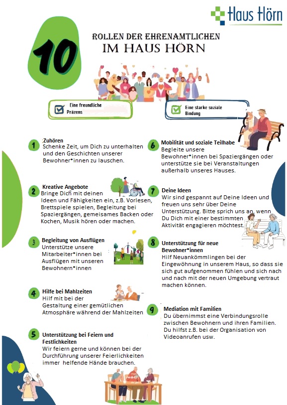 Ehrenamtlich Engagierte in Haus Hörn leistet Hilfe, kämpft gegen die Isolation älterer Menschen und hört zu. Der/die Ehrenamtler*in spielt bei den Bewohnern, aber auch beim Personal des Seniorenheims eine wichtige Rolle. Außerdem macht er/sie den Wohnort nach außen bekannt.